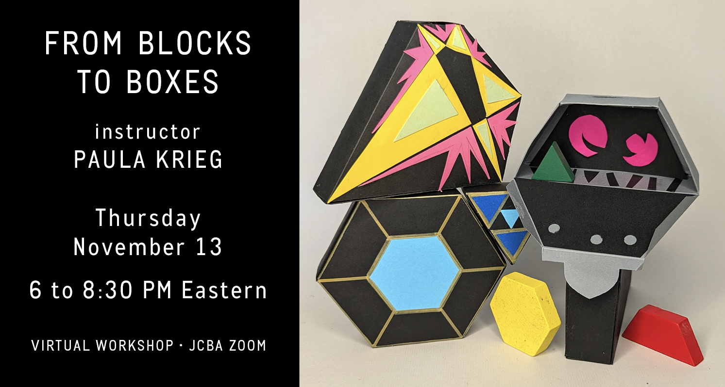 Inspired by the shapes of wooden pattern blocks, this workshop scales up and expands these geometric solids to enable you to construct practical and playful items. Our blocks and boxes will be made from cover-weight paper, using hidden magnets to increase impromptu sculptural possibilities. We will explore decorating the surfaces of our blocks, with an emphasis on fractal embellishments, and learn how to modify the provided templates to assemble the blocks into unusual boxes with closures. Your blocks and boxes will be decorative, inviting, and most importantly, whimsical and personal.