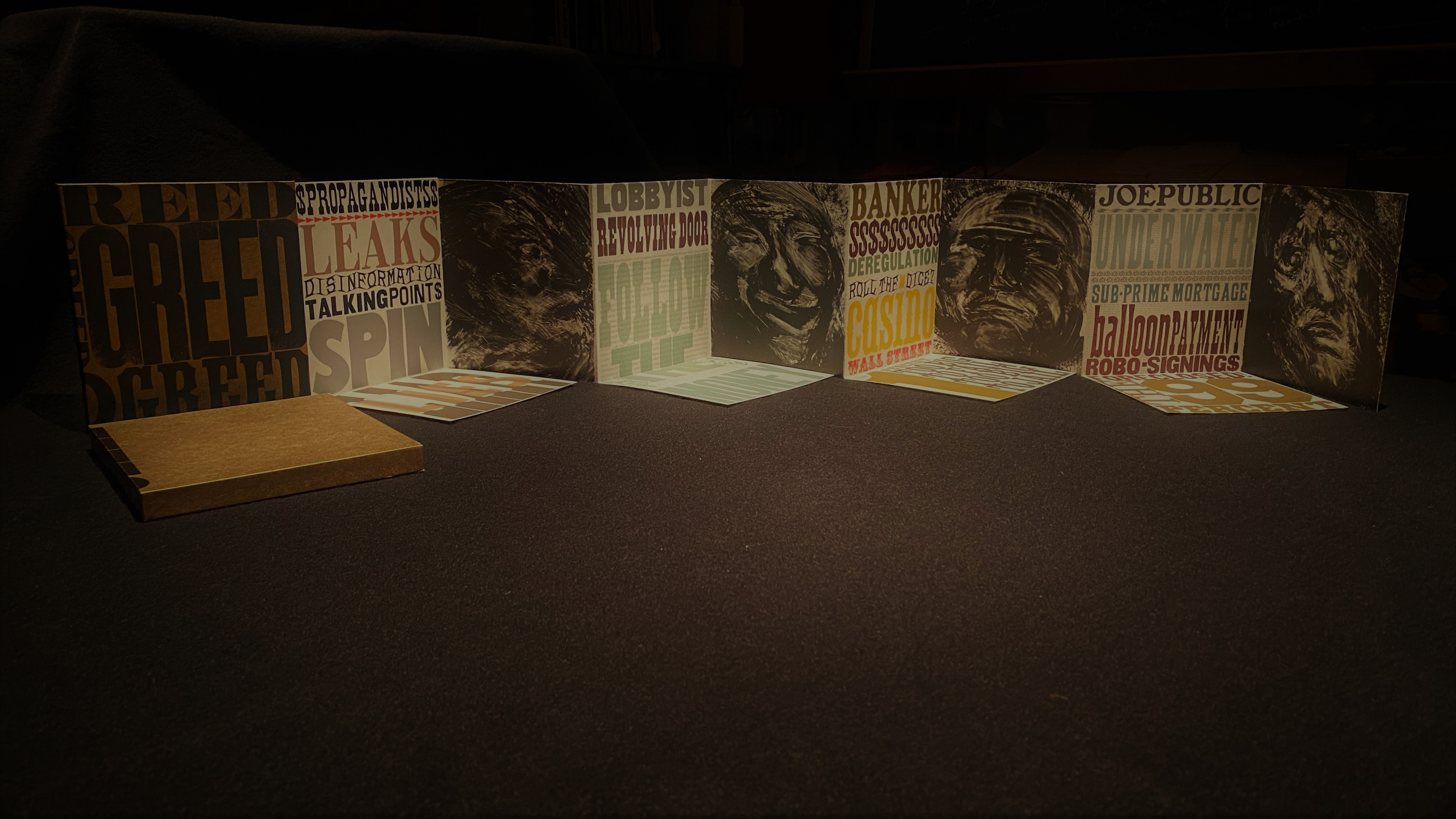 “Remember, remember, the fifth of November….”, was a poem, or ditty, created to remember the plot of Guy Fawkes to blow up the King of England and the Parliament. In a similar vein, Greed by Claire Van Vliet of Janus Press, is a work of art meant to remind us of a significant time much closer to the lives of Americans... READ MORE