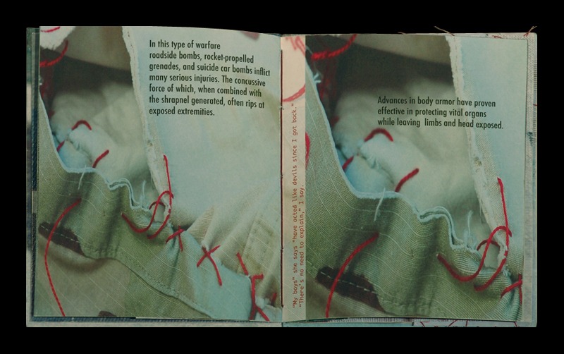 "Tear Here started with taking a set of military uniforms, cutting off the arms and legs, and lashing them back together with red thread. Then I took digital images, tore at the seams, and visually documented the seams ripping apart.... READ MORE