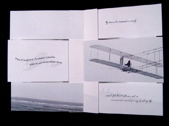 Chicago artist Karen Hanmer makes one of the best uses we've seen yet of Hedi Kyle's popular Flagbook structure: she uses the planes of the opposing panels to contrast two themes: archival documents about the Wright Brothers' first manned, powered flight are presented alongside the lyrics from the George and Ira Gershwin song "They All Laughed." READ MORE