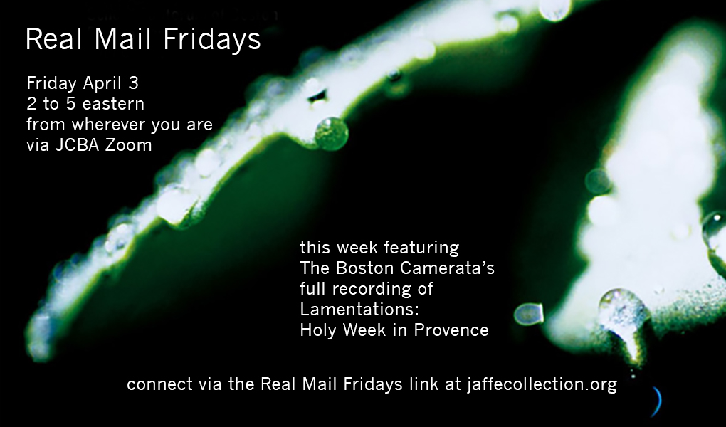 Our Real Mail Fridays social this week falls on the observation of Good Friday, which feels a strange day for a social, to be sure. We'll be taking a more subdued approach to our Real Mail Fridays soundtrack this week, and we'll devote the final hour of our gathering to a most sublime recording called "Lamentations: Holy Week in Provence." It's by the Boston Camerata, an early music ensemble you may be familiar with: Joel Cohen & Anne Azema of the Boston Camerata have performed several programs over the years at the Jaffe Book Arts Gallery and at FAU's University Theater, by our invitation. "Lamentations" is a most beautiful piece of music, and we will play it uninterrupted from 4:00 Eastern to the close of our online social.