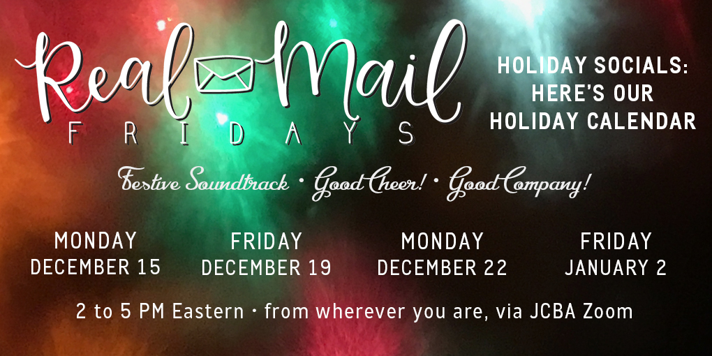 How does this all work? You provide the cards and the stamps (and the hot cocoa and eggnog); we'll provide the festive soundtrack. The music we've chosen for the season is anything but typical; we can guarantee you won't hear "It's the Most Wonderful Time of the Year" and in fact, most of this music is music you've probably not heard much of before. We provide the Zoom platform, too. And though it's billed as a card writing social, join us to do whatever it is you need to do: our Real Mail Fridays enthusiasts spend their time with us journaling, baking, making books, working at their desks, and even shoveling freshly fallen snow (it's true!). Some of them do, in fact, write letters. Whatever it is you're doing, you can do it in the company of friends from around the globe. Real Mail Fridays: three hours of quiet working time, set to a very Jaffe soundtrack, with a short break once or twice an hour to chat. Supremely heartwarming.
